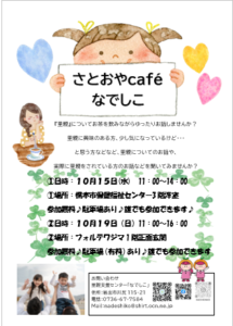 最終日である10月15日(水)の11:00~14:00に橋本市保健福祉センター3階洋室にて、さとおやcaféなでしこも開催いたしますのでお気軽にお越しください🎶